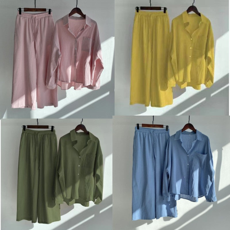 【25% Off Any 2 Pieces】Solid color cotton and linen shirt high waist loose trousers suit