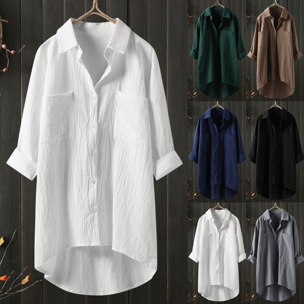 (25% off any two items)New casual solid color cotton and linen cardigan double pocket long sleeve shirt